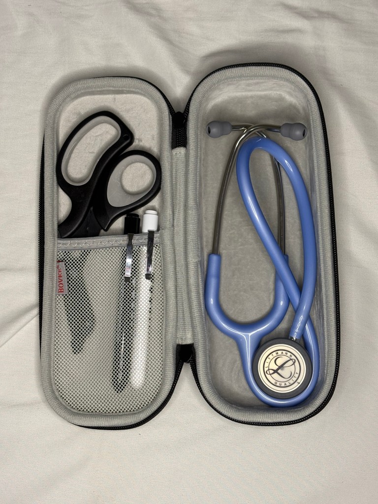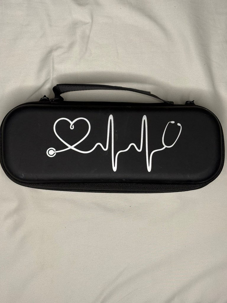 I bring my 3M Littmann Classic stethoscope in ceil blue to every shift. It’s super lightweight and has great sound quality. I purchased this at the beginning on nursing school and it still looks brand new 3 years later. I keep it in this sturdy case to help keep it clean and protected.