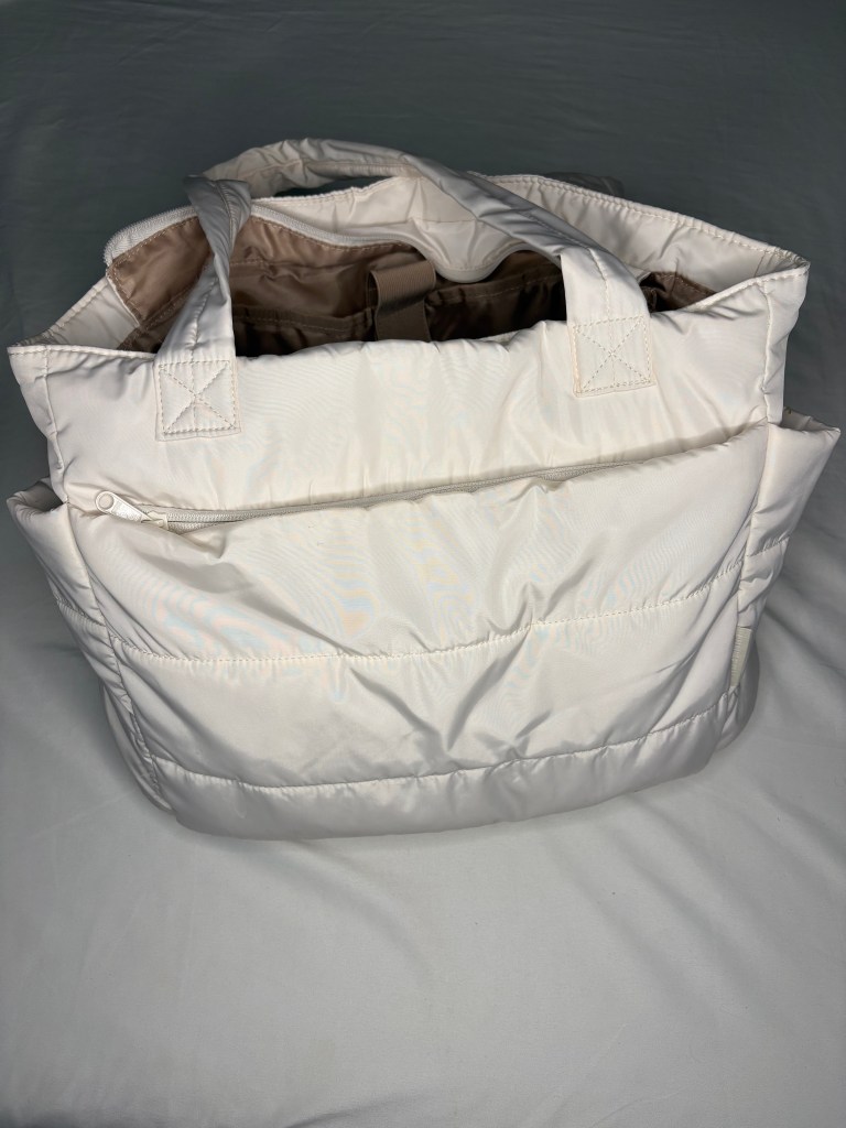 I use this puffy tote bag in the beige color and have loved it since I opened it from the package. My favorite thing about it is how much room it has. All of my essential items plus more easily fit within all of the multiple pockets.